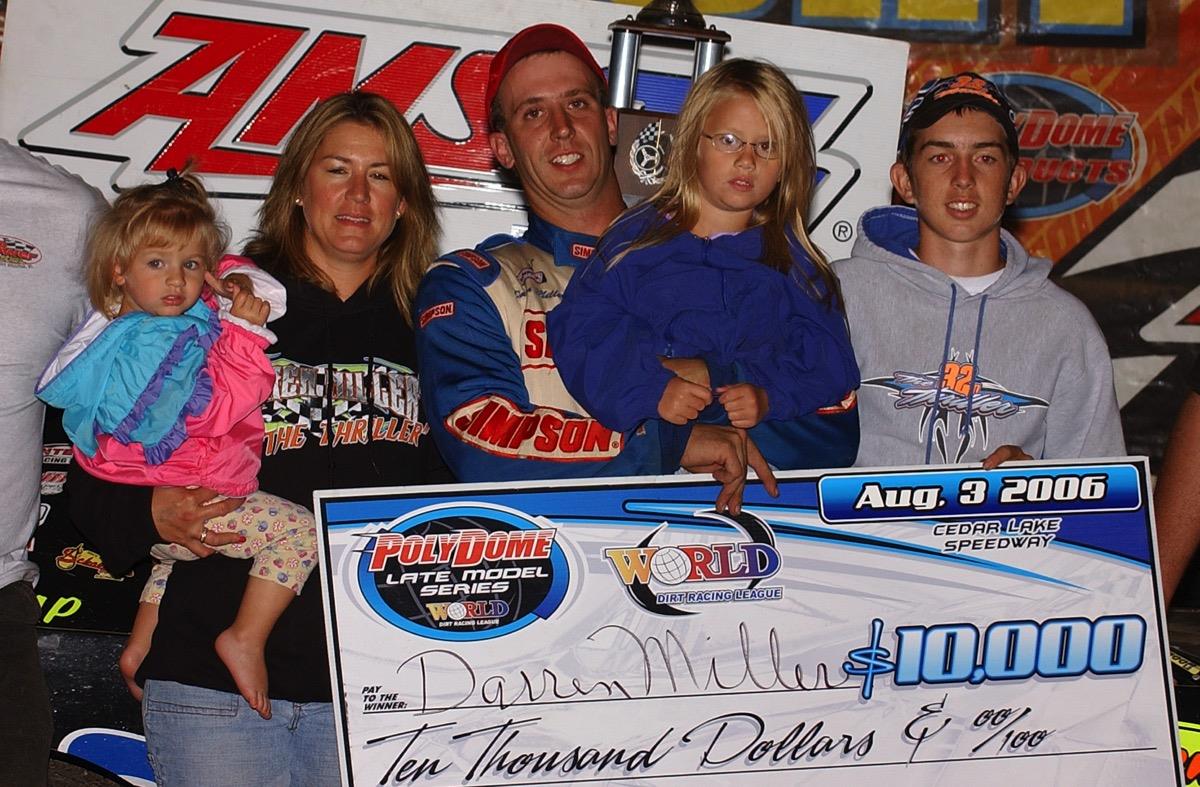 NEW RICHMOND, WI (August 3, 2006)- Darren "The Thriller" Miller led from start-to-finish Thursday night to win the Masters 50, a Lucas Oil Late Model Dirt Series co-sanctioned event at Cedar Lake Speedway. The event originally schedule as part of the traditional Masters weekend in June, but was postponed due to rain following the completion of qualifying races.