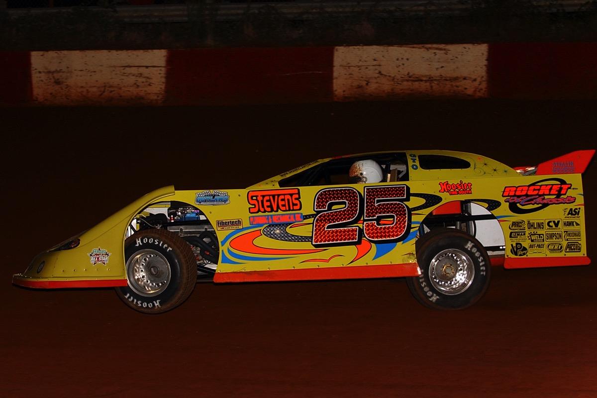 Justin Rattliff and Earl Pearson, Jr. lead the field to green in front of a standing room only crowd as Pearson, who entered the night with a 325 point lead over Don ONeal, grabbed the lead at the start. Wendell Wallace would quickly go to second followed by Rattliff, Scott Bloomquist and Ray Cook. Bloomquist made a pass on Rattliff for third on lap two as Cook following to fourth a lap later. Pearson, Wallace and Bloomquist would put distance between themselves and the rest of the field over the first eight circuits. But heavy traffic would allow Cook and Brian Shirley, who was fifth to close back to the top three. Pearson was still holding the point with Bloomquist all over Wallace for second on lap 10, but Bloomquist would bypass Wallace for second on lap 12 to set up a battle at the point with Pearson.