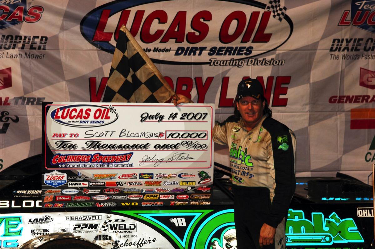COLUMBUS, MS (July 14, 2007)-In one of the most exciting and hard fought Lucas Oil Late Model Dirt Series events of the season on Saturday Night at Columbus Speedway, Scott Bloomquist of Mooresburg, TN repelled all challengers in taking the “Cliburn Tank Lines/Columbus Convention and Visitors Bureau” sponsored event earning $10,000 for his all-time series leading 14th career win and his third of the season. Bloomquist led all 50 laps but had to battle traffic and several other hungry competitors in taking a two-car length win over Dan Schlieper. Earl Pearson, Jr. finished third to regain the points lead with Steve Casebolt and Justin Rattliff completing the top five.