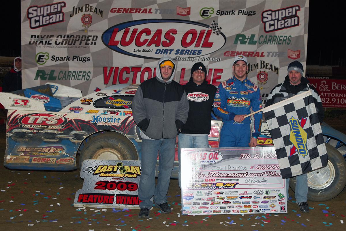 TAMPA, FL (February 5, 2009) – Setting a rapid pace after taking over the lead, 20-year-old Josh Richards of Shinnston, WV dominated the last half of the Lucas Oil Late Model Dirt Series event on Thursday Night at East Bay Raceway Park winning his first career LOLMDS event and his first ever at the home of the DART Winternationals. Richards held almost a half a lap lead over second place finisher Billy Moyer of Batesville, AR at the finish. Moyer who continued an impressive week with a win and now two second place finishes. Matt Miller of Waterville, OH placed third followed by Dennis Erb, Jr. of Carpentersville, IL and Mike Marlar of Winfield, TN.