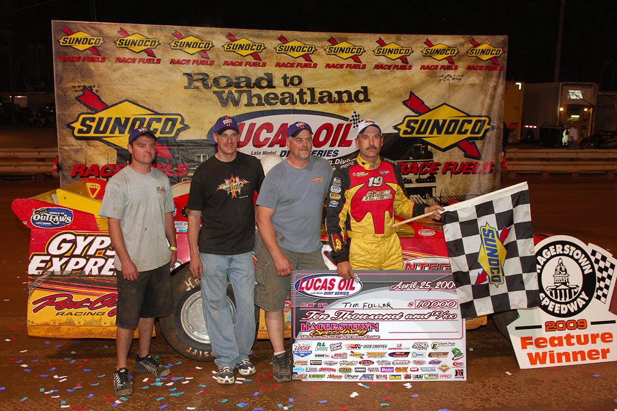 HAGERSTOWN, MD (April 25, 2009) – Tim Fuller of Watertown, NY lead the last 20 laps of the 28th Annual Stanley Schetrompf Classic and took his first career Lucas Oil Late Model Dirt Series event on Saturday Night at Hagerstown Speedway as he won the $10,000 top prize. Trailing Fuller to the finish line were Jimmy Mars, Scott Bloomquist, Rick Eckert and Brian Birkhofer.