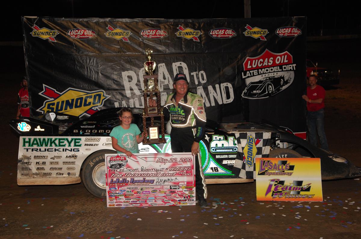 La SALLE, IL (May 22, 2010) – Before one of the largest crowds in the history of La Salle Speedway, reigning Lucas Oil Late Model Dirt Series Champion, Scott Bloomquist of Mooresburg, TN raced to the win. This victory marks his 21st career series win and the 390th of his Hall of Fame career. The Annual Spring Shootout on Saturday Night earned Bloomquist $10,000 for his triumph. Bloomquist crossed the line ahead of 11th starting Earl Pearson Jr. of Jacksonville, FL. Pearson passed Jimmy Owens of Newport, TN on the final lap for second. Owens saw his three-race win streak end by finishing third. Eighteenth starting Matt Miller of Waterville, Oh finished fourth followed by Doug Drown of Wooster, OH; who recorded his best ever LOLMDS finish in fifth.