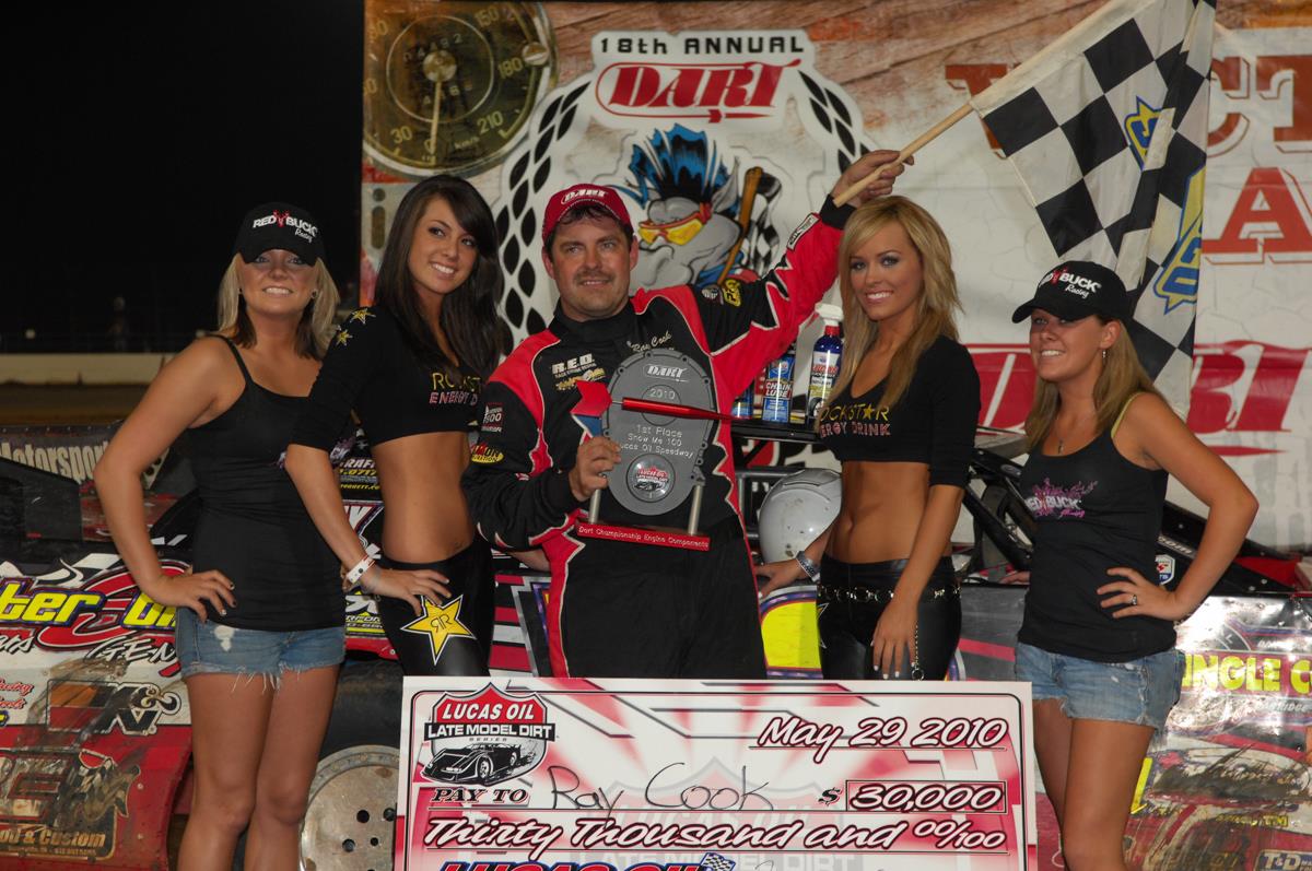 WHEATLAND, MO (May 29, 2010) – Ray Cook of Brasstown, North Carolina etched his name in the DART Show Me 100 history book for the second time, as he claimed the 18th edition of the event on Saturday night at Lucas Oil Speedway in Wheatland, Missouri in front of a capacity crowd in what could only be described as possibly one of the greatest races ever.