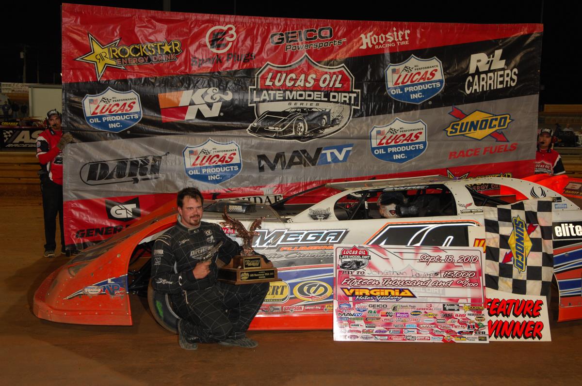 SALUDA, VA (September 18, 2010) – Jonathan Davenport of Blairsville, GA completed the weekend sweep in the Commonwealth State of Virginia as he captured the $15,000 to win ASI Racewear 31st Annual “USA 100” on Saturday Night at Virginia Motor Speedway. Davenport’s win marked his second Lucas Oil Late Model Dirt Series victory in two nights. Friday Night he captured the win at Winchester Speedway. Trailing Davenport to the finish line were current series point’s leader, Scott Bloomquist of Mooresburg, TN and 4-time series champion, Earl Pearson Jr. of Jacksonville, FL. Completing the top five were Steve Shaver of Vienna, WV and Dale McDowell of Chickamauga, GA.