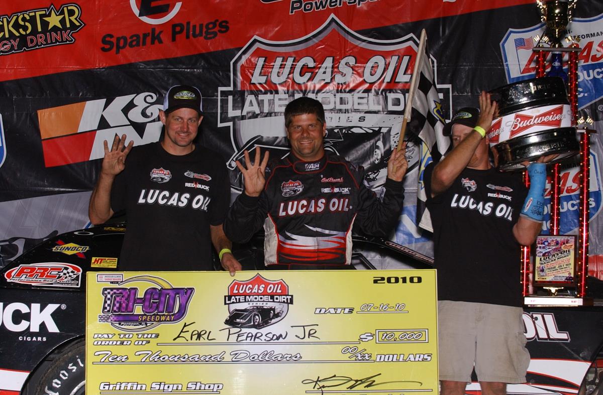 PONTOON BEACH, IL (July 16th, 2010)- Earl Pearson Jr. of Jacksonville, FL won a series record, fourth straight Lucas Oil Late Model Dirt Series event, tonight at Tri-City Speedway. He took home the $10,000 payday in winning the “Budweiser 50”. Pearson withstood a mid-race challenge from several drivers as he went on to lead all 50 laps of the event. It was his seventh series win of the year.
