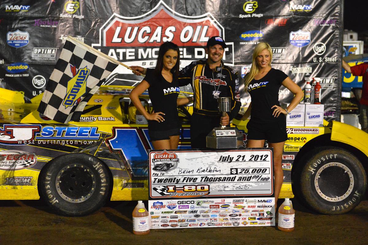 GREENWWOD, NE (July 21, 2012) – Brian Birkhofer of Muscatine, IA completed a perfect weekend at I-80 Speedway, taking home the Second Annual Silver Dollar Nationals on Saturday Night. He earned $26,000 for his victory in the Lucas Oil Late Model Dirt Series and Lucas Oil MLRA sanctioned event. Birkhofer dominated the race after taking the lead from Billy Moyer of Batesville, AR on lap 11.