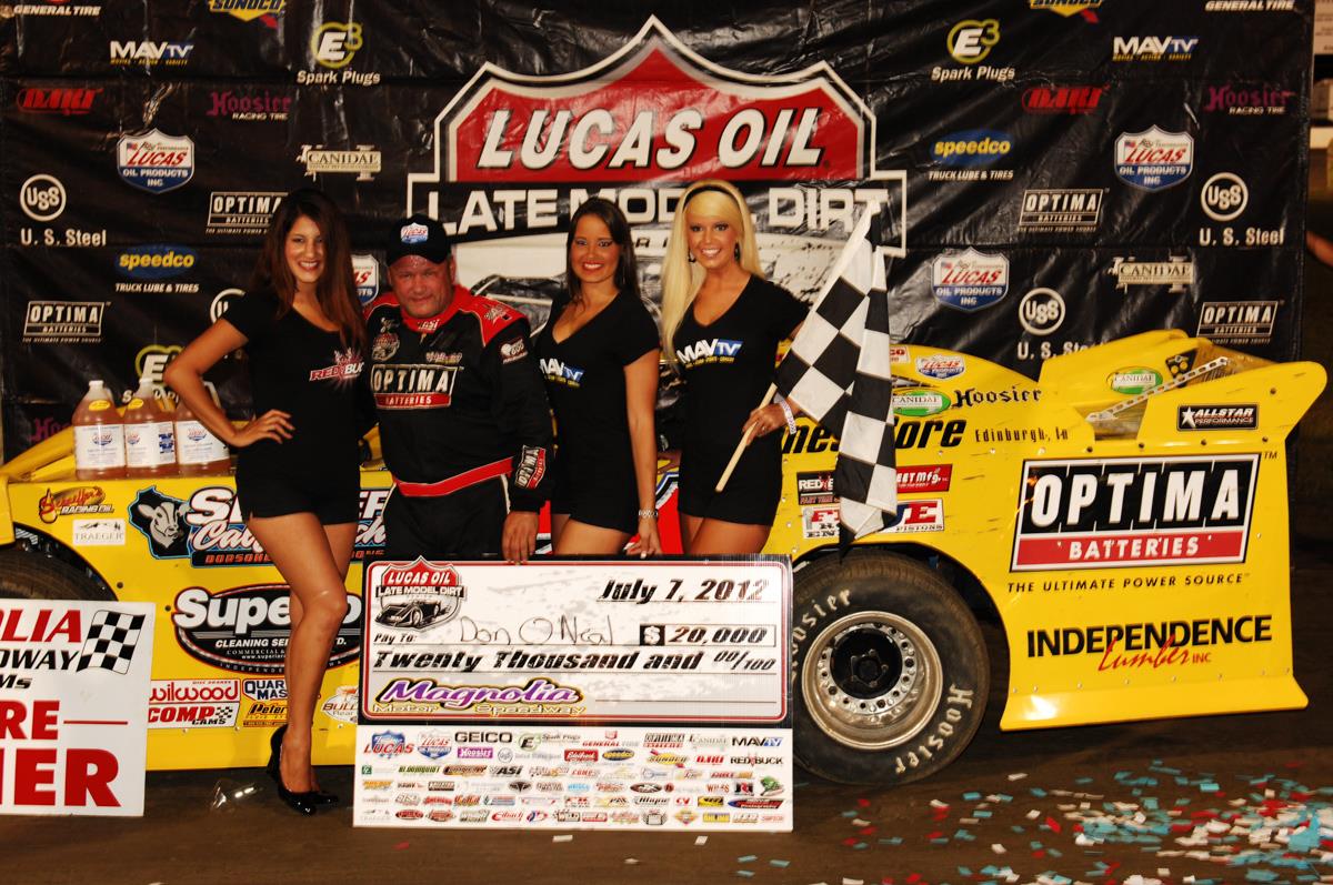 COLUMBUS, MS (July 7, 2012) – Don O’Neal of Martinsville, IN dominated the Columbus Convention Center and Visitors Bureau Clash at the Mag on Saturday Night at Magnolia Motor Speedway. O’Neal started ninth and took the lead from Wendell Wallace of Batesville, AR on lap 20 and then outran Scott Bloomquist of Mooresburg, TN the rest of the way to capture the $20,000 to win Lucas Oil Late Model Dirt Series event.