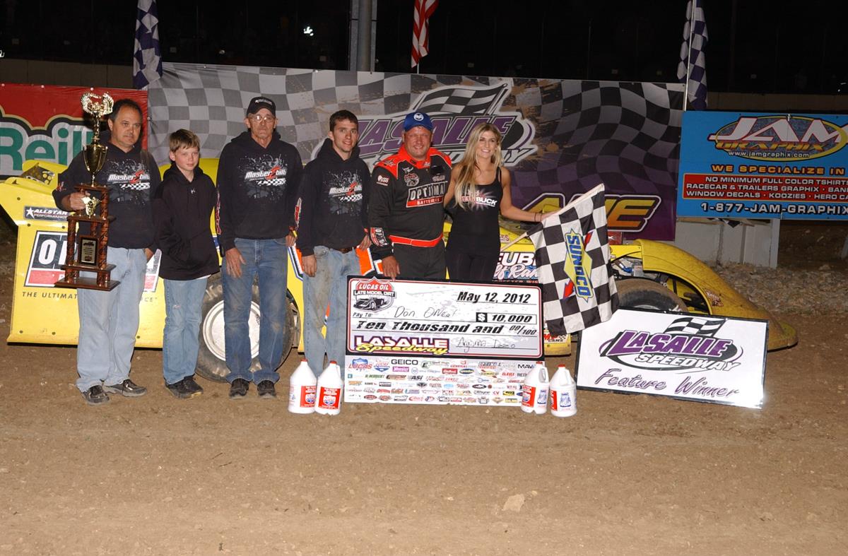 La Salle, IL (May 12, 2012) – Don O’Neal of Martinsville, IN continued his recent hot streak on the Lucas Oil Late Model Dirt Series tour by winning for the third time in his last four races. O’Neal grabbed the lead at the start of the race. He cruised to the $10,000 victory in the Jeff’s Engine Masters-sponsored Spring Shootout at La Salle (IL) Speedway. O’Neal has now won seven series events in 2012.