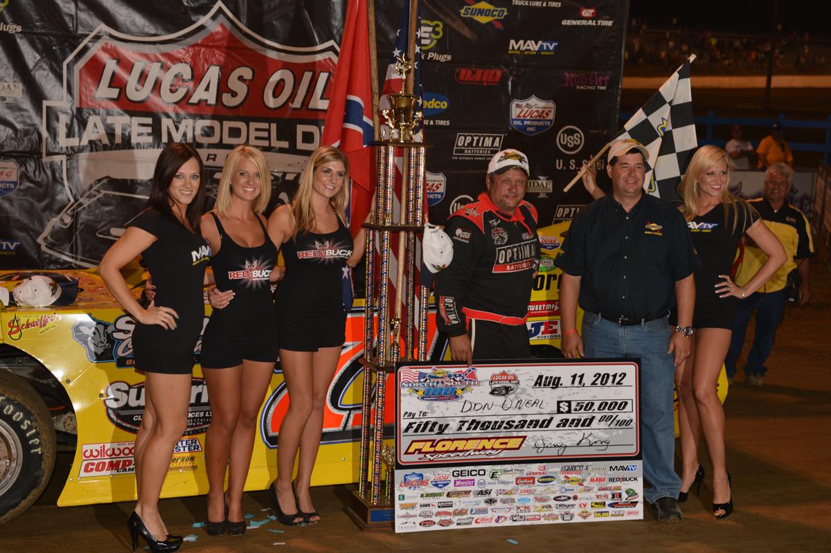 UNION, KY (August 11, 2012) – Don O’Neal of Martinsville, IN passed race leader, Jimmy Owens of Newport, TN on lap 85 and then went on to capture his first career Sunoco Race Fuels North/South 100 Presented by Lucas Oil on Saturday Night at Florence Speedway. With a record-setting crowd on hand, O’Neal captured the $50,000 to win event in his 14th attempt. Owens finished second followed by Steve Casebolt of Richmond, IN; Rick Eckert of York, PA; and Steve Francis of Ashland, KY.