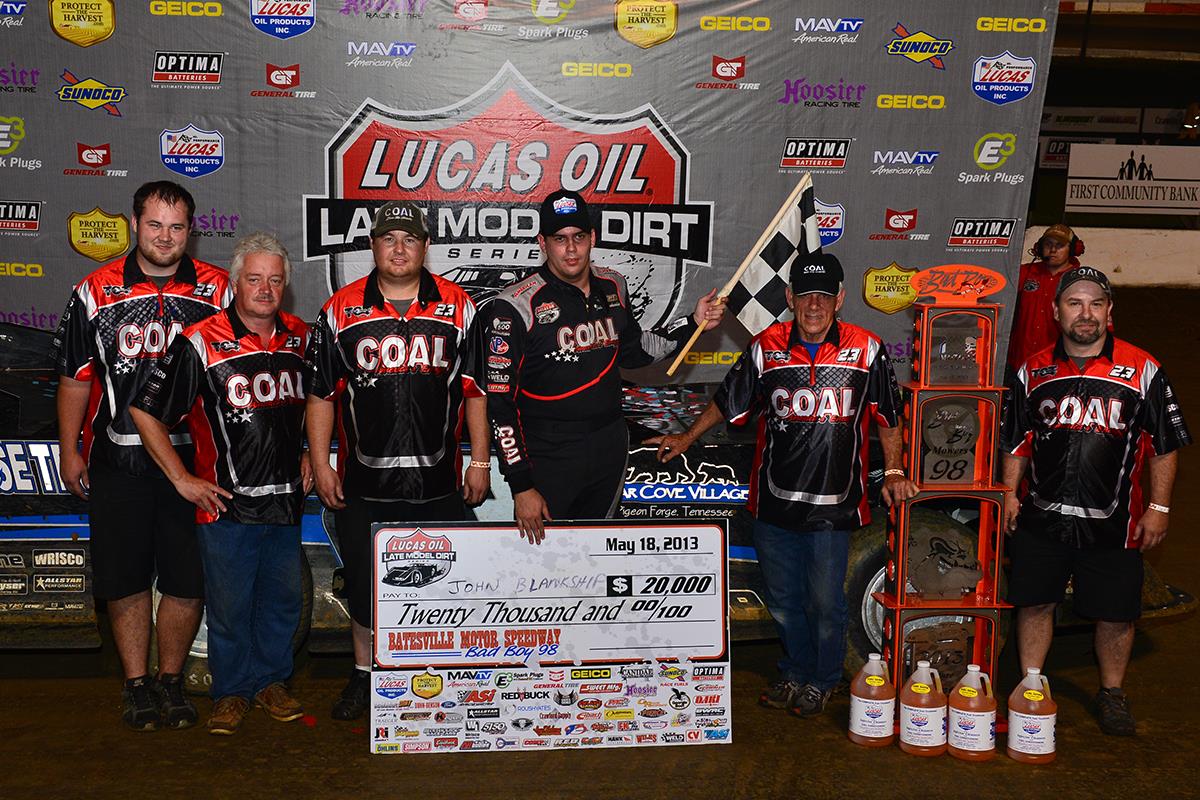 LOCUST GROVE, AR (May 18, 2013) – John Blankenship took home the biggest win of his racing career tonight at Batesville Motor Speedway. Blankenship won $20,000 by winning the Second Annual Bad Boy 98 sanctioned by the Lucas Oil Late Model Dirt Series, and marked the first series win for him this year.