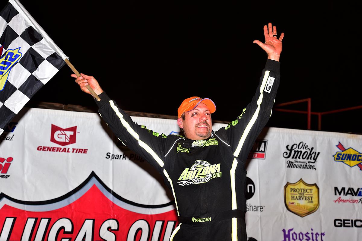 "To win this race two years in a row is great," said Madden in Lucas Oil Victory Lane for the second time this season. "This is a brand new Sweet-Bloomquist car; it was like driving a Cadillac all night long. I don't know exactly what happened to Scott [Bloomquist] there in traffic. Next thing I knew he was spun around and had to go to the tail. He [Bloomquist] has been so good to me. He and Randy build a super-fast race car. We had a good race with Dale [McDowell] there for a while, and he left the door open enough on the bottom heading into turn-one and I was able to get the lead."