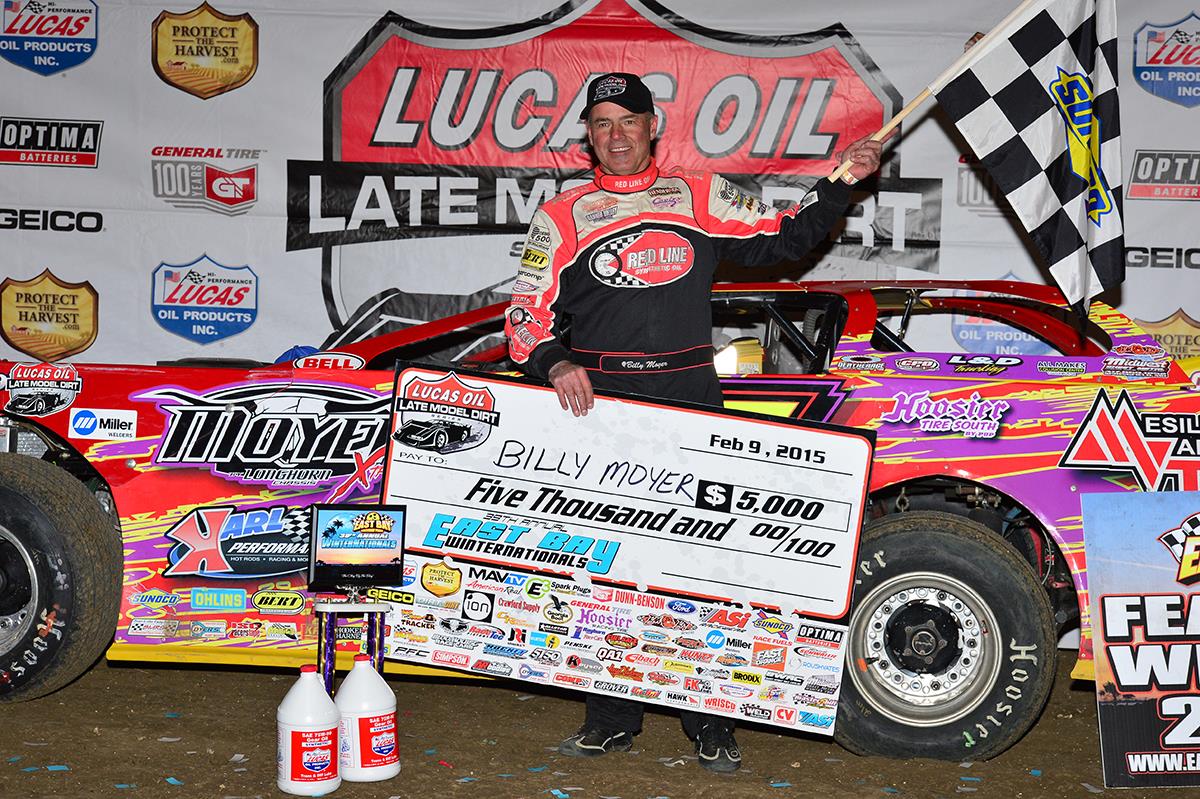TAMPA, FL (February 13, 2015) – Billy Moyer took the lead at the start of tonight’s 25-lap Monday Make-Up Winternationals event at East Bay Raceway Park and never looked back. Brandon Sheppard closed the gap in the second half of the race, and challenged Moyer on several occasions, but could never quite pull even with the veteran from Batesville, Arkansas. Following Moyer and Sheppard to the finish were Billy Moyer Jr., Gregg Satterlee, and Devin Moran.