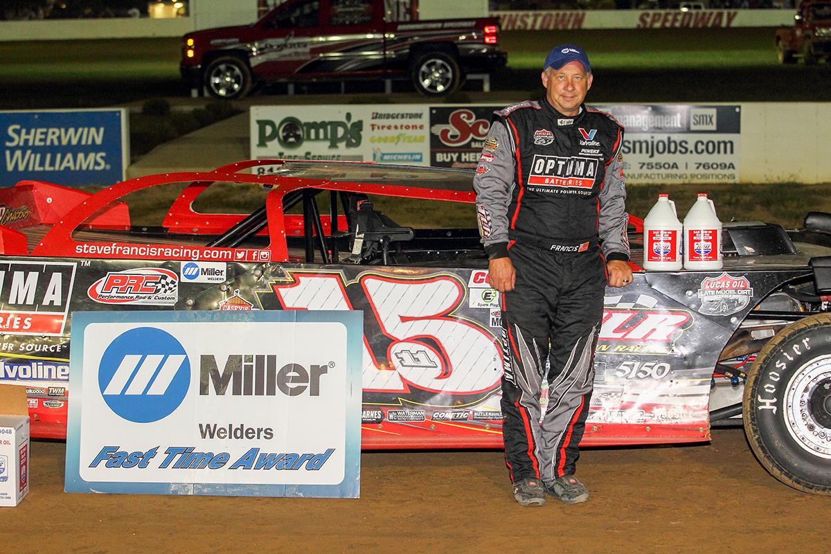 BROWNSTOWN, IN (September 23, 2016) – Hall-of-Fame driver Steve Francis set the overall Miller Welders Fast Time on Friday Night at Brownstown Speedway. Francis was fastest among the 42 entrants on night one of the 37th Annual Jackson 100.