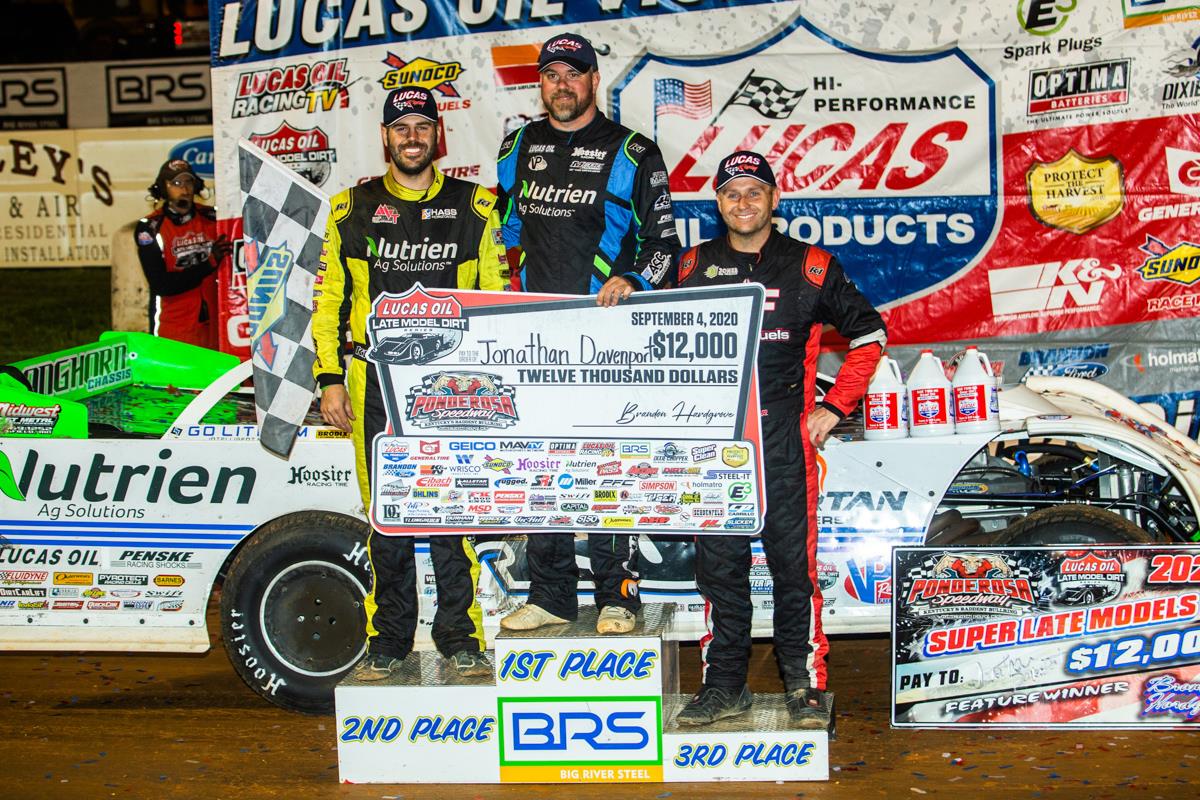 JUNCTION CITY, KY (September 4, 2020) – Jonathan Davenport notched his third Lucas Oil Late Model Dirt Series win of the season on Friday Night at Ponderosa Speedway. Davenport, the 3-time and reigning series champion, led all the way in winning the 16th Annual John Bradshaw Memorial and earning his 50th career LOLMDS win.