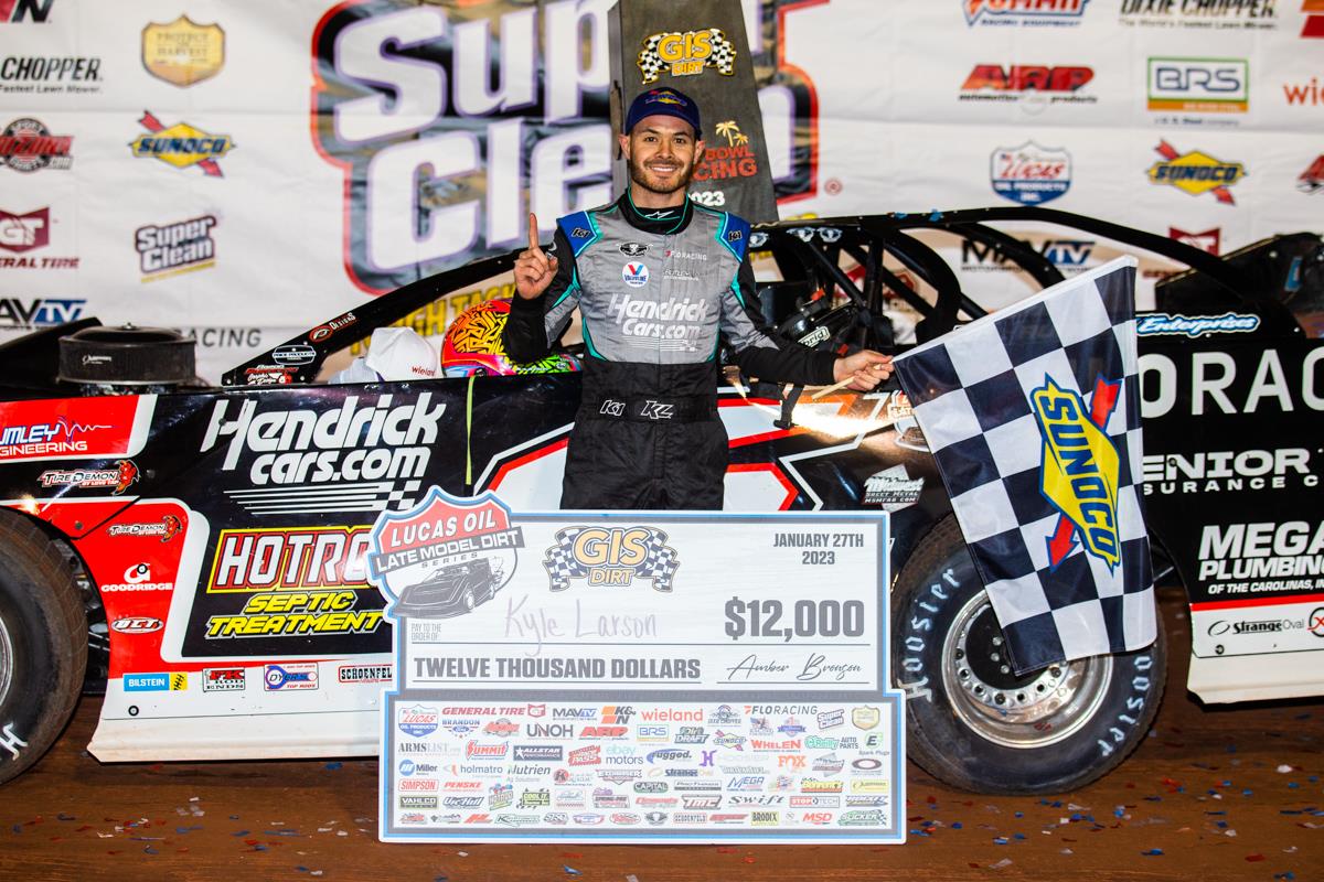 WAYNESVILLE, Ga. (January 27, 2023) – Kyle Larson won a thriller during Friday’s Super Clean Super Bowl of Racing - presented by ICON Electric Vehicles. Larson passed Ricky Thornton Jr. on lap 48 to win the Lucas Oil Late Model Dirt Series event at Golden Isles Speedway.