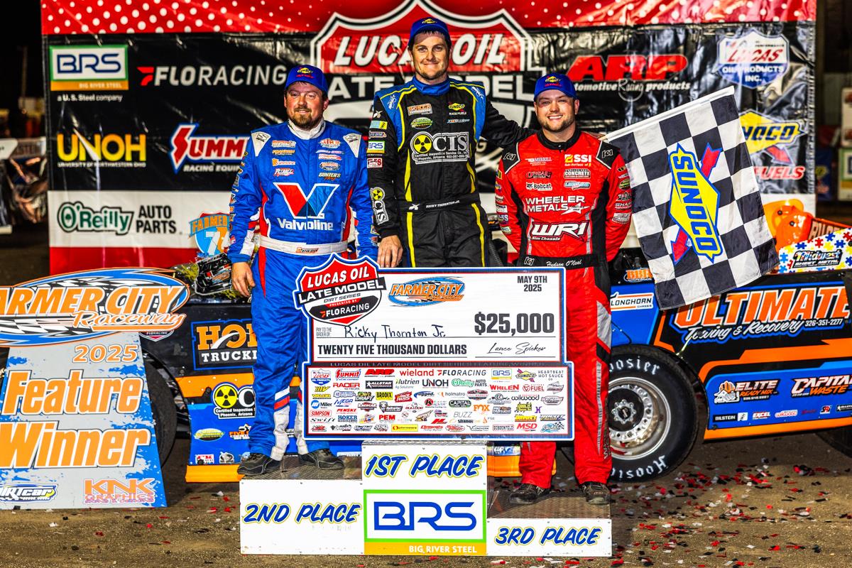 FARMER CITY, IL (May 9, 2025) – Reigning Lucas Oil Late Model Dirt Series National Champion and current points leader, Ricky Thornton Jr., passed Brandon Sheppard for the lead on lap 66 and went on to win the Farmer City 74 on Friday at Farmer City Raceway. The win marked his second consecutive victory in the annual May race, as the Chandler, Arizona native earned $25,000 for his seventh series win of 2025.